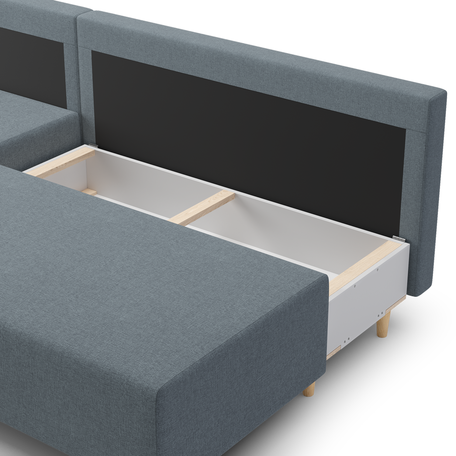 Небольшой, компактный, но при этом универсальный угловой диван с ровным спальным местом для ежедневного использования, с механизмом еврокнижка. Прямые ровные формы в стиле подойдут почти для любого современного интерьера. Отсутствие подлокотников позволяет сэкономить место в помещении. Надежность каркаса обеспечена качественными материалами из дерева и прочными соединениями его частей, а ящик для белья поможет организовать дополнительное место хранения.